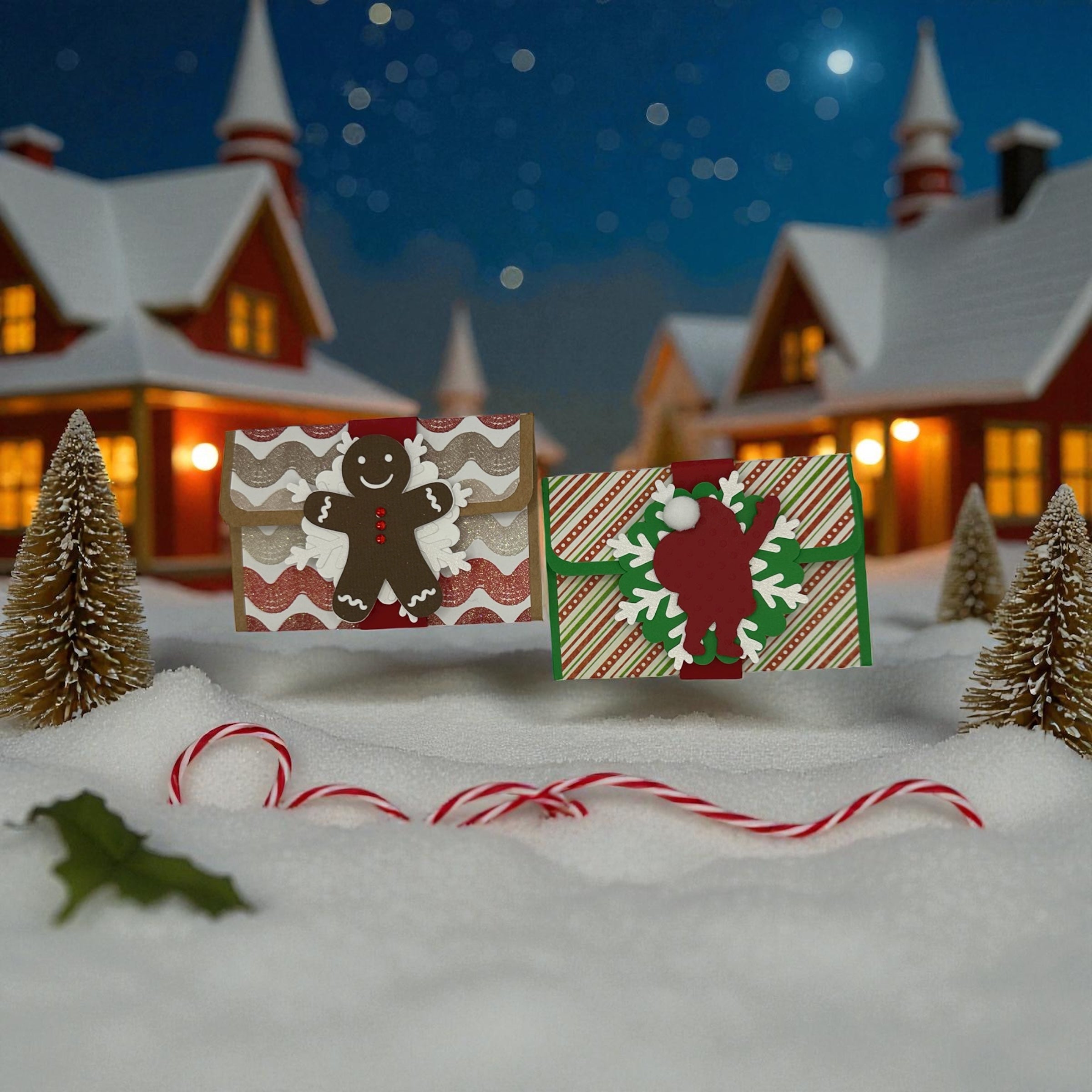 Bring extra holiday cheer to your gifting with this adorable handmade set of gift card holders featuring a smiling gingerbread man and a jolly Santa silhouette. Each holder is carefully layered with festive papers, textured details, and classic Christmas colors—turning even the simplest gift card into something special.
